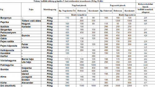 Néhány belföldi zöldség-gyümölcs 5. heti értékesítési árszerkezete 2016-ban