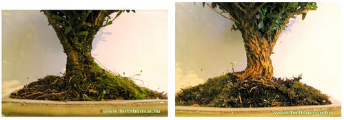 A bonsai szépségének befolyásoló tényezője a gyökérnyak (nebari) részlete. A fotón látható mohával benőtt, (elhanyagolt) gyökérnyak nem a legmegfelelőbb látvánnyal ruházza fel a kis bonsaiunk. Célszerű, finoman eltávolítani kis célszerszámmal a mohapárnát, valamint kis ecsettel, vagy kefével letisztítani a törzs alsó részét, így kezdenek alakot ölteni a fában rejlő apró szépségek. Reméljük hasznos tanácsokkal láttuk el, kérdése lenne a metszéssel kapcsolatban keressen elérhetőségeinken: